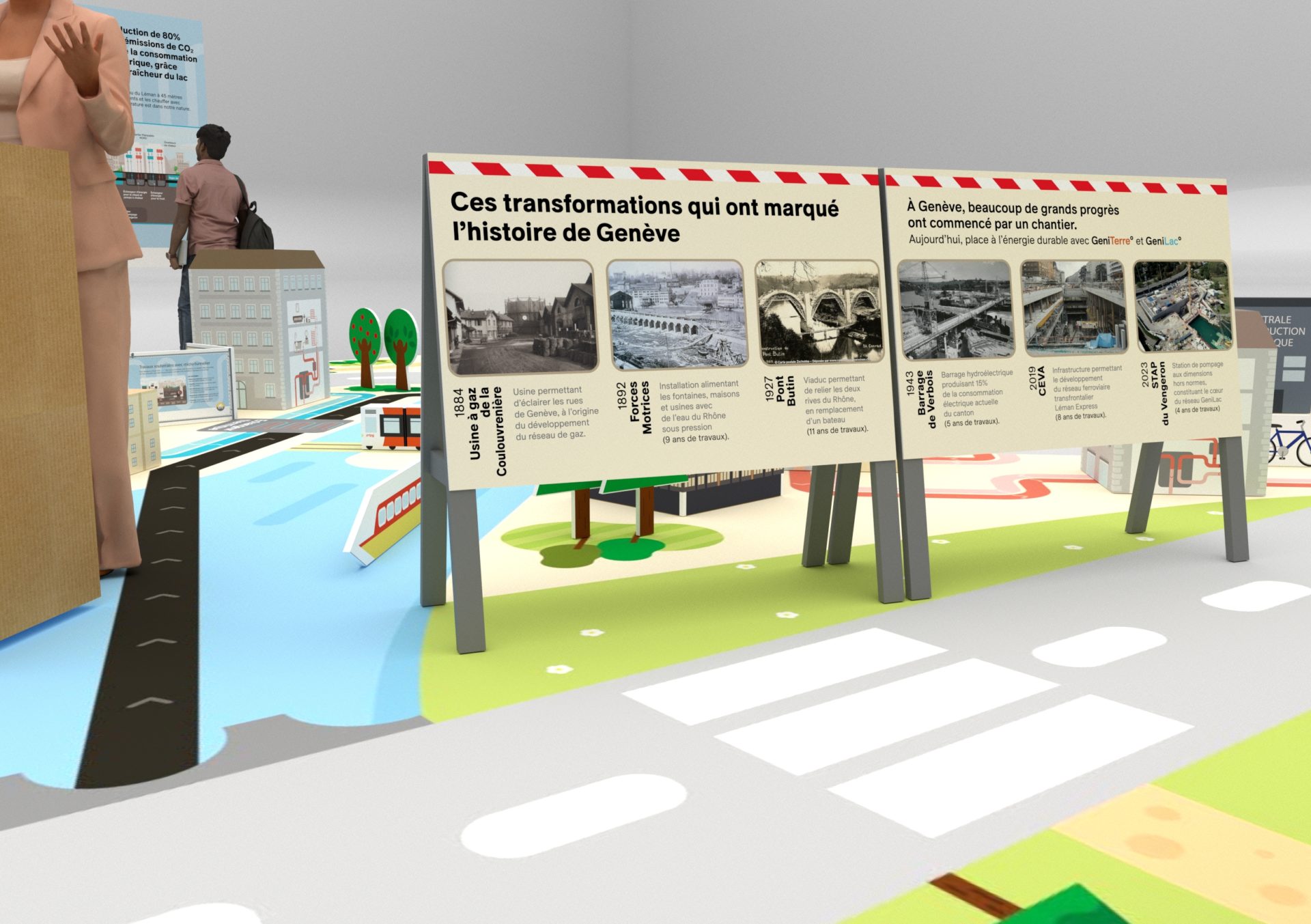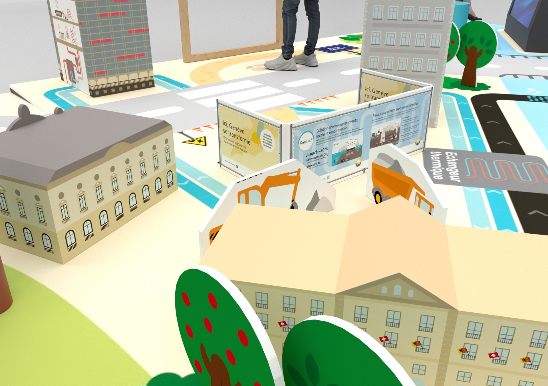 Notre concept : représenter Genève en version miniature, pour rendre visibles — et compréhensibles — les réseaux de chaleur renouvelable qui se déploient sous nos pieds.